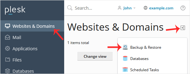 2. Go to Websites & Domains > Click on the Pull icon > Choose Backup & Restore.